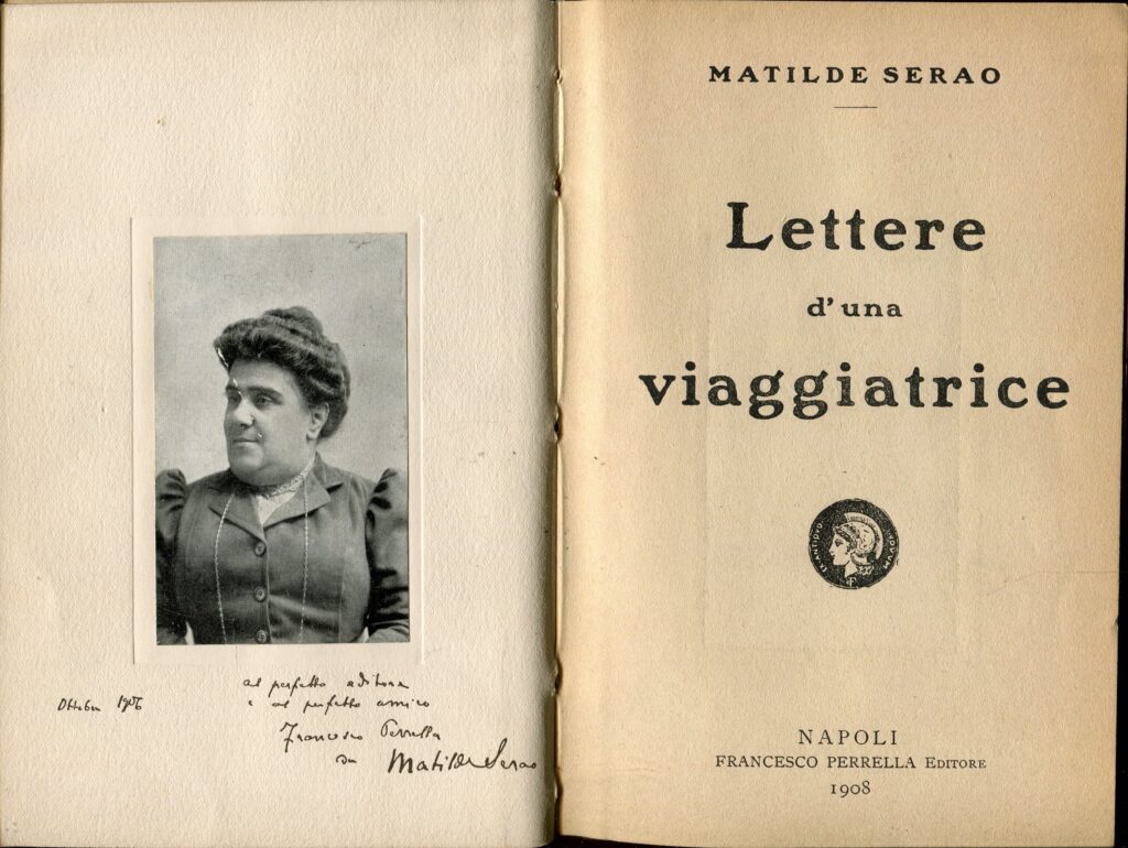 Matilde Serao (1856 – 1927) scrittrice  e giornalista attiva a Napoli dove ha diretta vari quotidiani, considerata tra i maggiori esponenti del “Verismo”. Di questa vasta raccolta di resoconti di viaggi, l’ampio capitolo finale da p. 347 a 477 è intitolato “Alla Montagna debbo ritornare” ed è una citazione da “La figlia di Jorio” di D’Annunzio.  Vi descrive un suo viaggio in varie località della Valle D’Aosta con tappe a Gressoney, Ayas, in Valtournanche e al Cervino, Courmayeur e il Santuario di N. D. de la Guérison, il Piccolo San Bernardo e Aosta.