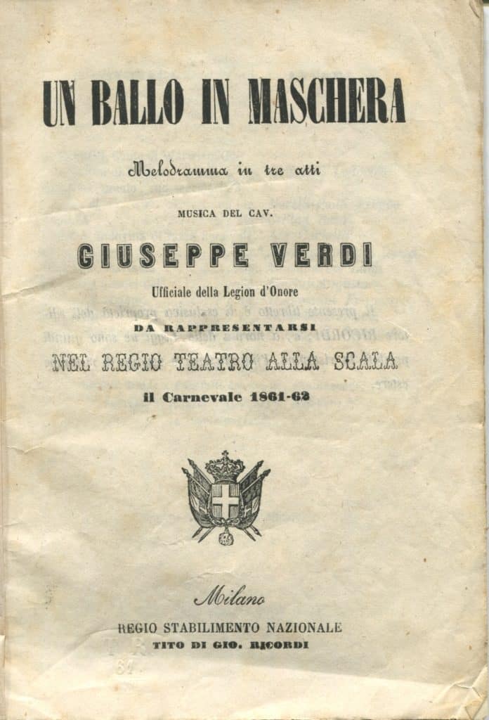Libretto della prima esecuzione al Teatro alla Scala de “Un ballo in maschera” l’8 gennaio 1862. La prima assoluta si era tenuta a Roma al Teatro Apollo il 17 febbraio 1859. Autore del libretto Antonio Somma. In terza pagina l’elenco dei cantanti. 70 € |